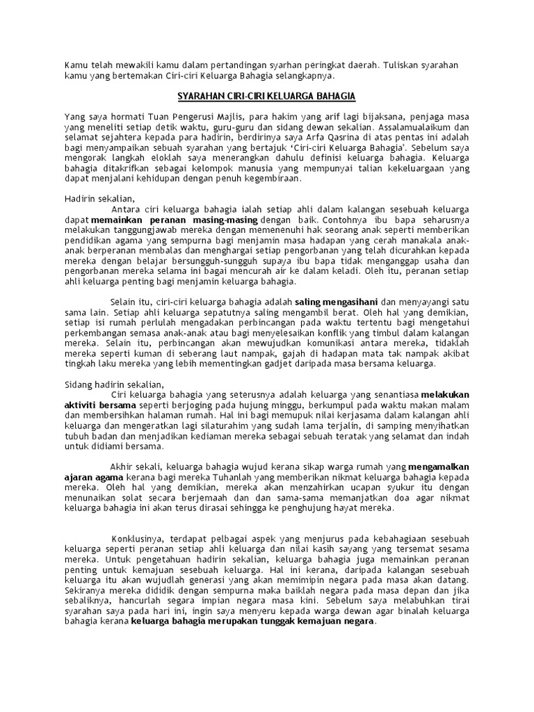 Menghabiskan waktu cuti dengan berkelah atau berekreasi bersama keluarga akan memberikan peluang kepada ahli keluarga untuk berhibur di samping meluangkan masa untuk mengeratkan hubungan di antara mereka. Keluarga bentukan (dyadic family) adalah keluarga baru yang terbentuk dari pasangan yang telah cerai atau kehilangan pasangannya. Pendidikan dini inilah yang kemudian membentuk orang tua dapat mempelajari cara mendidik anak. Peranan ketua keluarga membentuk keluarga bahagia. Perjanjian terhadap kebutuhan biologis (seks). Keluarga yang bahagia akan sentiasa menjaga maruah ahli keluarganya. Sebagai seorang ketua keluarga hendaklah menunjukkan dan mempamerkan contoh terbaik untuk dicontohi oleh anak dan isterinya. Tanggungjawab membentuk keluarga bahagia tidak hanya bergantung pada satu pihak sebaliknya memerlukan kerjasama dan komitmen daripada sebagai konklusinya, dapat disimpulkan bahawa terdapat peranan pelbagai pihak selain ahli keluarga dalam usaha melahirkan keluarga bahagia. Tahankan perjalanan biduk rumah tangga yang. Berbagai peranan yang terdapat didalam keluarga adalah sebagai berikut : Pengertian keluarga menurut para ahli. Tujuan keluarga ini adalah melepas anak remaja dan memberi tanggung jawab serta kebebasan yang lebih besar untuk mempersiapkan. Keluarga yang bahagia akan sentiasa menjaga maruah ahli keluarganya.