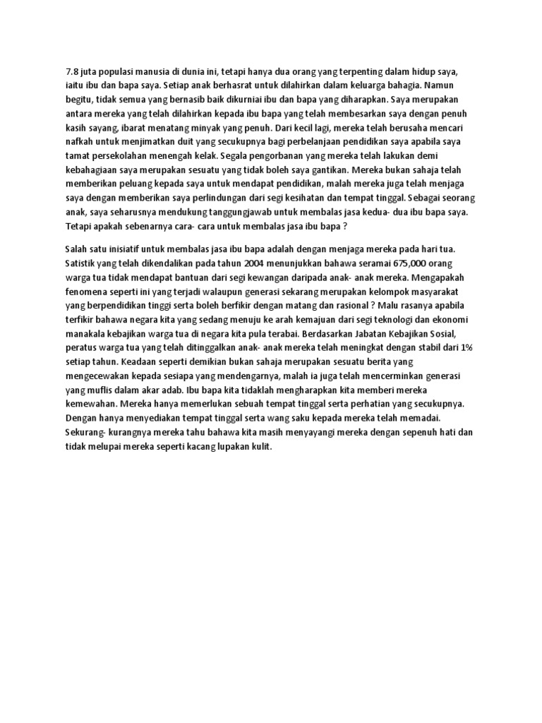 Mereka menatang kita bagai minyak yang penuh. Ibu bapa ialah insan yang sangat penting dalam kehidupan kita. Muat naik kerangka karangan yang telah siap dibina. Karangan fakta cara cara menghormati ibu bapa. About press copyright contact us creators advertise developers terms privacy policy & safety how youtube works test new features press copyright contact us creators. Semasa kita kecil dahulu, ibu bapa adalah insan yang bertanggungjawab melahirkan kita. Akhlak mulia akan menyebabkan seseorang itu mentaati perintah agama menghormati orang lain. Cara cara menghormati ibu bapa. Contoh karangan cara cara menghormati ibu bapa. Perlu menghormati mereka kerana merekalah kita lahir di dunia ini. More images for karangan cara cara menghormati ibu bapa » Ibu bapa ialah insan yang sangat penting dalam kehidupan kita. Sep 07, 2015 · terdapat banyak cara yang boleh kita lakukan sebagai tanda menghormati mereka.